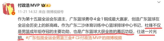 此前,媒体人付政浩就直言:杜锋不仅是男篮成年组夺冠的主要功勋,也是广东篮球大获全胜的幕后功臣,仕途一片光明。如今当选广东省篮球协会书记,也肯定了杜锋在本届全运会的努力和功绩。