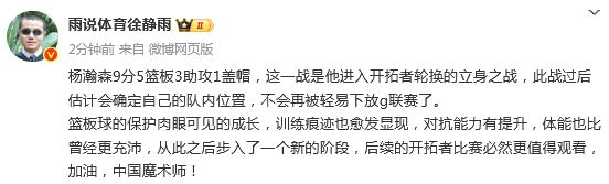 赛后,篮球评论员徐静雨发文点评:杨瀚森9分5篮板3助攻1盖帽,这一战是他进入开拓者轮换的立身之战,此战过后估计会确定自己的队内位置,不会再被轻易下放g联赛了。