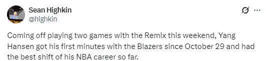 在比赛中,开拓者队记者肖恩-海金点评了杨瀚森的表现,并预测他能在明日对阵公牛队的背靠背比赛中继续上场。“前方赛前,也并未得到有关杨瀚森会上场的任何消息,但考虑到球队正在遭遇伤病侵袭,瀚森上场也没那么令人奇怪。我猜明天对公牛他还会出场,因为罗威大概率会缺席背靠背。”