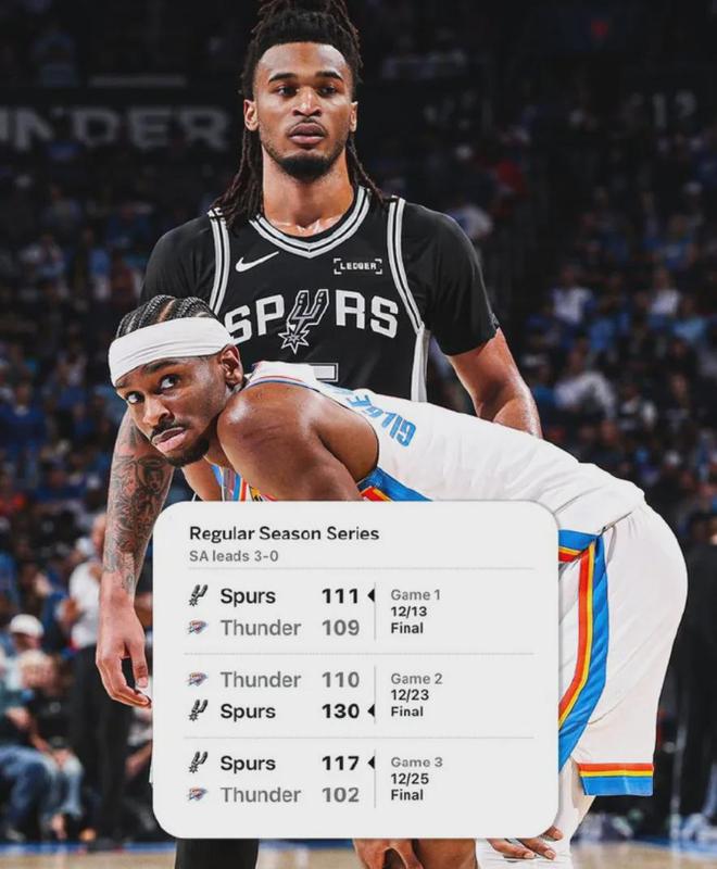 单赛季3比0雷霆,马刺上一次做到这一点还是略显遥远的2010-11赛季,双方本赛季常规赛最后一次交锋,在2026年1月14日。