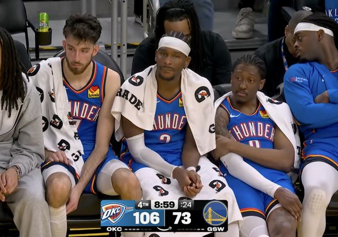 其实本场比赛从过程到结果,都没有太多悬念,勇士输掉了他们情理之中的一场比赛,雷霆不可阻挡,亚历山大延续20+纪录。而透过本场比赛,有几件事能反应勇士当下队内状态。第一,就是库明加拒绝背锅出战。正常比赛科尔不让库明加打,轮到这种必输的局,派上库明加,纯属膈应人。库明加也不傻,最快2周就能离开勇士,何必还在这继续付出呢。勇士内部一定是存在一些分歧的,尤其是在前段时间,从巴特勒到格林,包括库里都在声援库明加,只不过无法改变库明加被交易的结局。