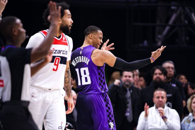 在交出华丽数据的同时,37岁的老威少依旧是能量满满,也用自己的激情将一潭死水的国王队激活。