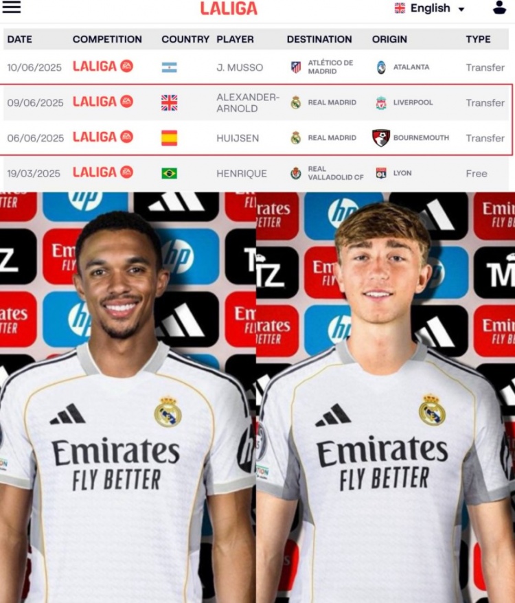 西甲官方:皇马已经为新援阿诺德和怀森完成注册