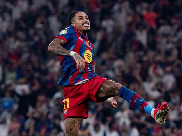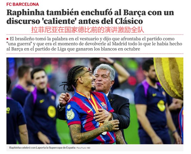 西超杯的半决赛、决赛,巴萨分别5-0横扫毕尔巴鄂竞技、3-2战胜皇马,拉菲尼亚均是梅开二度,2场4球,状态极佳。除了进球、助攻、压迫、防守之外,拉菲尼亚还是巴萨的战魂。《世界体育报》就透露拉菲的激情演讲:
