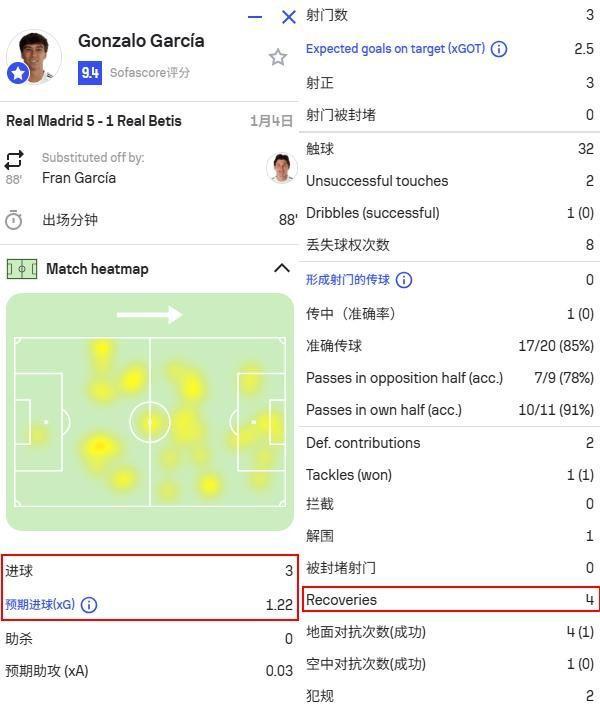 这一点从热图上也可以看到,贡萨洛的覆盖范围还是很大的。考虑到他不是那种持球型,这个热图本身还无法体现出他单场跑动超过11000米的特点。