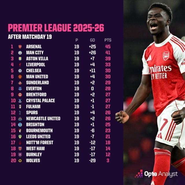 桑德兰主场0比0战平曼城,英超半程战罢(19轮),阿森纳以4分优势成为半程冠军(由于赛程关系,枪手已2战维拉,和伯恩茅斯未曾交手,巧合的是,这3队主帅阿尔特塔、埃梅里、伊劳拉都是巴斯克人)。 本赛季英超联赛中,迄今只有两支球队保持主场不败,分别是阿森纳(9胜1平0负)和桑德兰(5胜5平0负)。桑德兰本赛季在光明球场已经比他们上一次参加英超(2016-17赛季)时多拿了6分,当时他们整个赛季19个英超主场只拿到了14分。