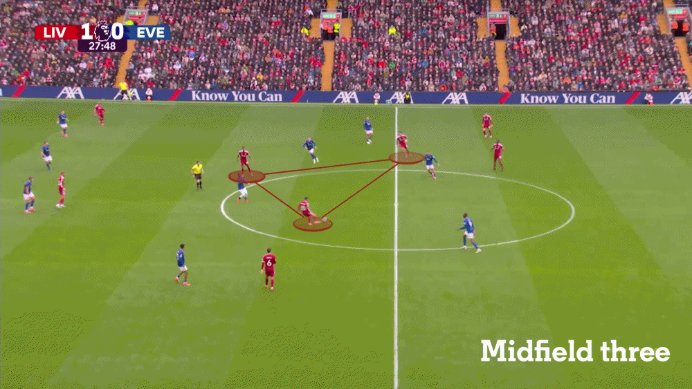 撇开阵型本身不谈,利物浦的进攻组织自季前赛以来已经发生了变化,随着越来越多的球队找到限制赫拉芬贝赫发挥的方法(加上阿诺德的离队),斯洛特要求他的后腰回撤到两名中后卫之间,形成一个灵活的三后卫阵型,这可以扰乱对手的人盯人防守体系,并有助于推进推进。
