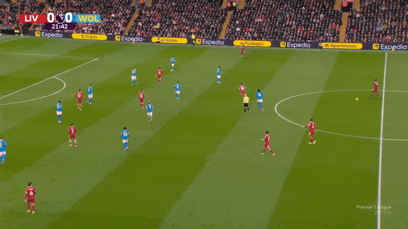 琼斯的抗压迫能力在这套体系中是一项宝贵的特质,而他的中场搭档麦卡利斯特近几个月来也偶尔会前插到更靠前的位置,下面这场对阵狼队的比赛就是一个例子:琼斯回撤,边后卫压上,麦卡利斯特插上到他们身后。