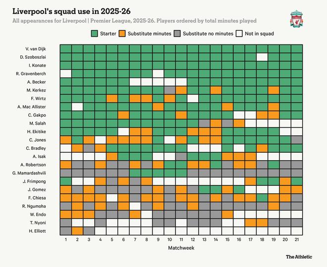 利物浦队内伤病不断,影响了球队的节奏,伊萨克、弗林蓬、布拉德利、阿利松、加克波和戈麦斯都在赛季初几个月因伤缺阵,下表列出了利物浦队内球员在英超联赛中的出场时间占比。