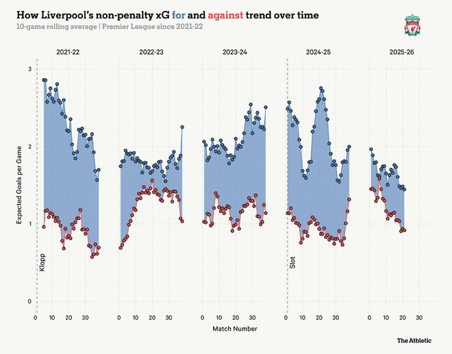 利物浦的预期进球数(xG)数据(包括进球和丢球)进一步反映了这一点,他们创造机会的质量(基于10场比赛的滚动平均值)呈现明显的下降趋势,这与他们在令人担忧的丢球数之后需要在防守端解决的问题(红线所示)相吻合。