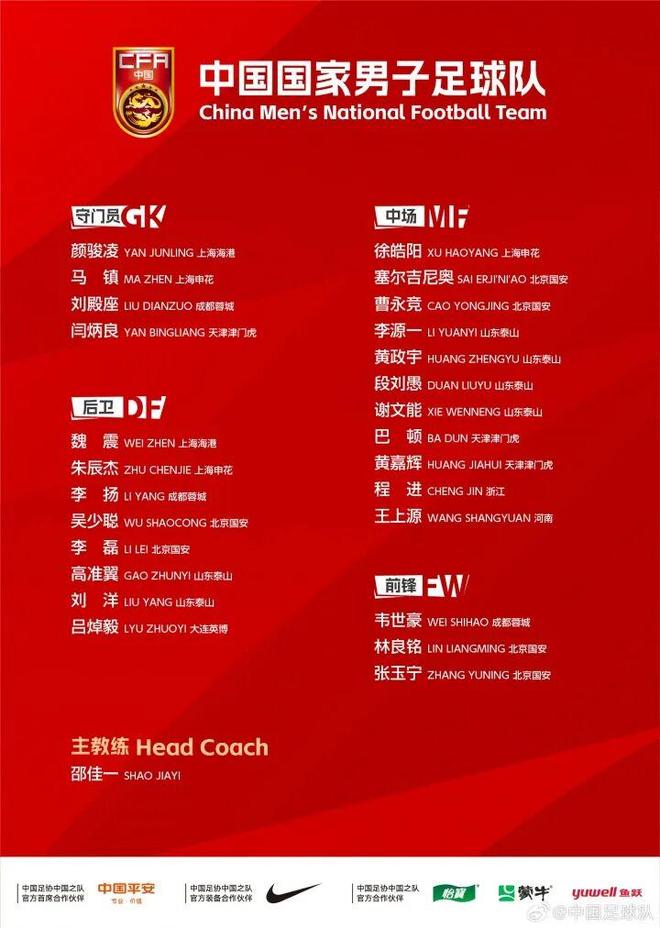 锋线包括了韦世豪( 成都蓉城)、张玉宁(北京国安)、林良铭(北京国安)。对比久尔杰维奇在东亚杯时征召的队员,整体上的人员出入有13人之多。不过,大部分的老人回归入选也是让平均年龄达到了28.5岁,确实有点老。